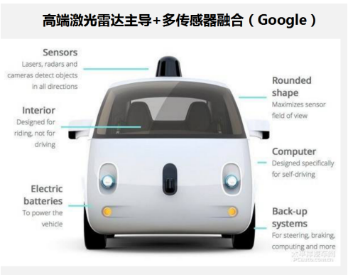 目前,國際上自動駕駛環(huán)境感知的技術(shù)路線主要有兩種:一種是以特斯拉為代表的毫米波雷達主導(dǎo)的多傳感器融合方案,另一種以高成本激光雷達為主導(dǎo),典型代表如谷歌Waymo。我們來分析一下這兩條線路對前方路況分析所使用的傳感器: